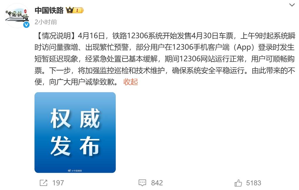 4月16日,铁路12306系统开始发售4月30日车票,上午9时起系统瞬时访问量骤增、出现繁忙预警,部分用户在12306手机客户端(App)登录时发生短暂延迟现象,经紧急处置已基本缓解,期间12306网站运行正常,用户可顺畅购票。下一步,将加强监控巡检和技术维护,确保系统安全平稳运行。由此带来的不便,向广大用户诚挚致歉。