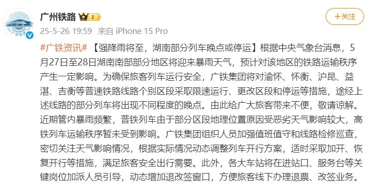 中国铁路广州局集团有限公司官方微博26日晚间发布消息称,根据中央气象台消息,5月27日至28日湖南南部部分地区将迎来暴雨天气,预计对该地区的铁路运输秩序产生一定影响。为确保旅客列车运行安全,广铁集团将对渝怀、怀衡、沪昆、益湛、吉衡等普速铁路线路个别区段采取限速运行、更改区段和停运等措施,途经上述线路的部分列车将出现不同程度的晚点。由此给广大旅客带来不便,敬请谅解。