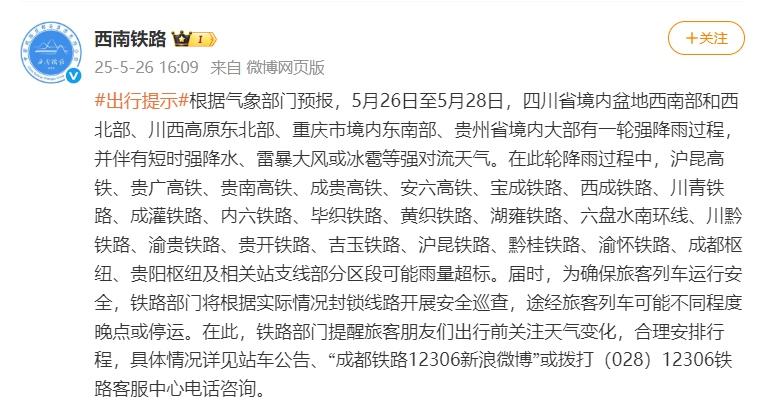 中国铁路成都局集团有限公司官方微博26日下午发布消息称,根据气象部门预报,5月26日至5月28日,四川省境内盆地西南部和西北部、川西高原东北部、重庆市境内东南部、贵州省境内大部有一轮强降雨过程,并伴有短时强降水、雷暴大风或冰雹等强对流天气。在此轮降雨过程中,沪昆高铁、贵广高铁、贵南高铁、成贵高铁、安六高铁、宝成铁路、西成铁路、川青铁路、成灌铁路、内六铁路、毕织铁路、黄织铁路、湖雍铁路、六盘水南环线、川黔铁路、渝贵铁路、贵开铁路、吉玉铁路、沪昆铁路、黔桂铁路、渝怀铁路、成都枢纽、贵阳枢纽及相关站支线部分区段可能雨量超标。届时,为确保旅客列车运行安全,铁路部门将根据实际情况封锁线路开展安全巡查,途经旅客列车可能不同程度晚点或停运。
