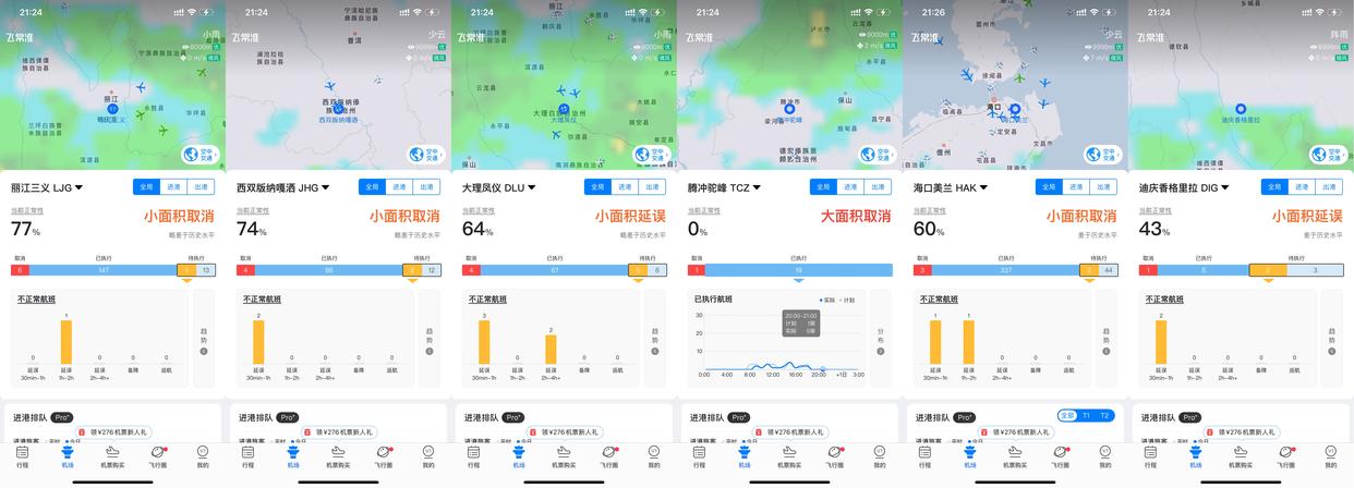 飞常准APP数据显示,截至发稿,云南部分机场已小面积取消或延误,腾冲驼峰机场大面积取消;此外,海口美兰国际机场亦小面积取消。