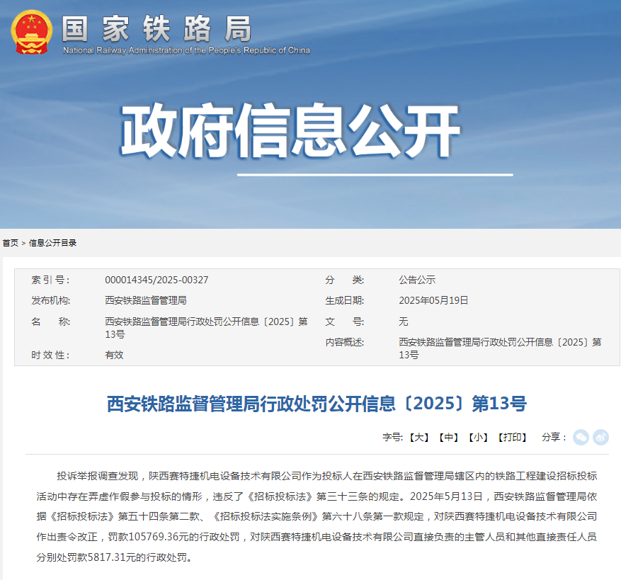 《公开信息》显示,2025年5月13日,西安铁路监督管理局依据《招标投标法》第五十四条第二款、《招标投标法实施条例》第六十八条第一款规定,对陕西赛特捷机电设备技术有限公司作出责令改正,罚款105769.36元的行政处罚,对陕西赛特捷机电设备技术有限公司直接负责的主管人员和其他直接责任人员分别处罚款5817.31元的行政处罚。