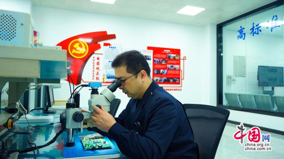 6月25日, 株洲机务段党员攻关带头人周俊龙在显微镜下检查电子插件板上的芯片。李红武 摄