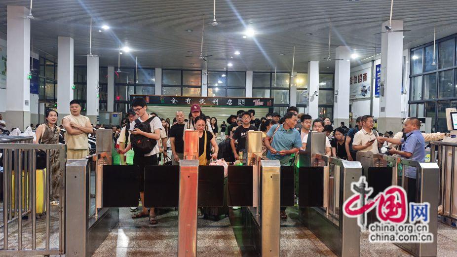 2025年7月2日,宜春车务段萍乡站客运员在检票口进行人工检票、引导旅客过闸机。彭元媛 摄