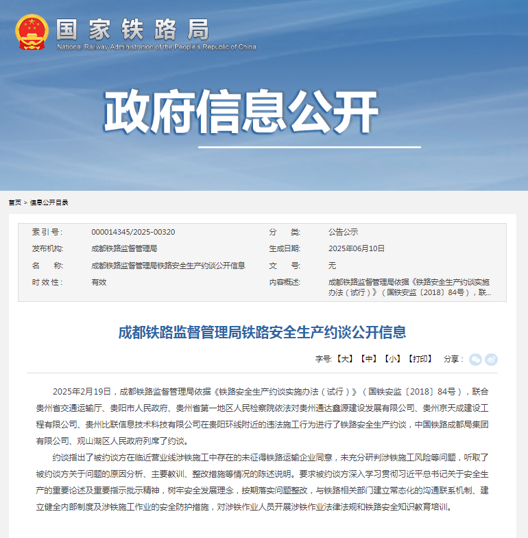 来自国家铁路局的消息显示:近日,成都铁路监督管理局发布《铁路安全生产约谈公开信息》(以下简称《公开信息》)。《公开信息》称,2025年2月19日,成都铁路监督管理局依据《铁路安全生产约谈实施办法(试行)》(国铁安监〔2018〕84号),联合贵州省交通运输厅、贵阳市人民政府、贵州省第一地区人民检察院依法对贵州通达鑫源建设发展有限公司、贵州京天成建设工程有限公司、贵州比联信息技术科技有限公司在贵阳环线附近的违法施工行为进行了铁路安全生产约谈,中国铁路成都局集团有限公司、观山湖区人民政府列席了约谈。