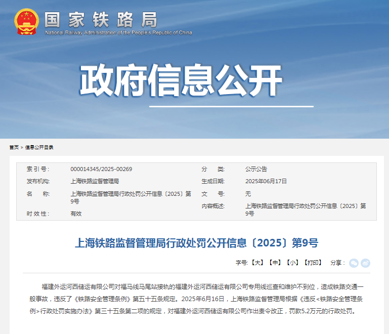 来自国家铁路局的消息显示:近日,上海铁路监督管理局发布《行政处罚公开信息〔2025〕第9号》(以下简称《公开信息》)。《公开信息》称,福建外运河西储运有限公司对福马线马尾站接轨的福建外运河西储运有限公司专用线巡查和维护不到位,造成铁路交通一般事故,违反了《铁路安全管理条例》第五十五条规定。