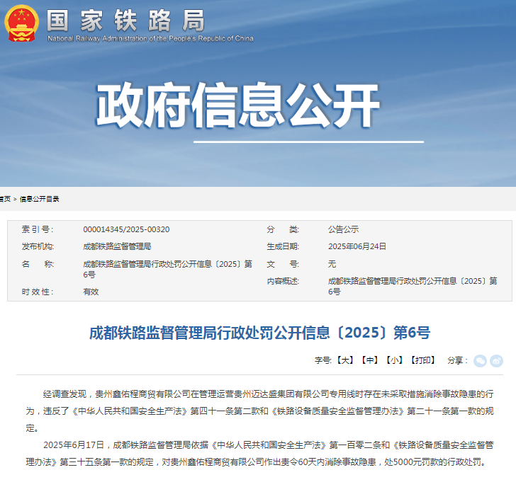 来自国家铁路局的消息显示:近日,成都铁路监督管理局发布《行政处罚公开信息〔2025〕第6号》(以下简称《公开信息》)。《公开信息》称,经调查发现,贵州鑫佑程商贸有限公司在管理运营贵州迈达盛集团有限公司专用线时存在未采取措施消除事故隐患的行为,违反了《中华人民共和国安全生产法》第四十一条第二款和《铁路设备质量安全监督管理办法》第二十一条第一款的规定。