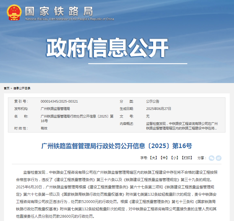来自国家铁路局的消息显示:近日,广州铁路监督管理局发布《行政处罚公开信息〔2025〕第16号》(以下简称《公开信息》)。《公开信息》称,监督检查发现,中铁路安工程咨询有限公司在广州铁路监督管理局辖区内的铁路工程建设中存在将不合格的建设工程按照合格签字行为,违反了《建设工程质量管理条例》第三十六条以及《铁路建设工程质量监督管理规定》第三十九条的规定。