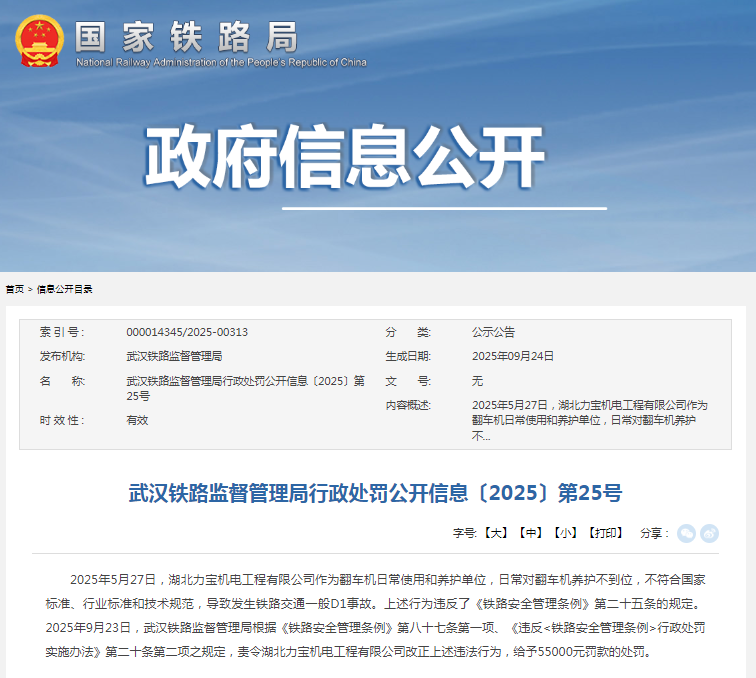 来自国家铁路局的消息显示:近日,武汉铁路监督管理局发布《行政处罚公开信息〔2025〕第25号》(以下简称《公开信息》)。《公开信息》称,2025年5月27日,湖北力宝机电工程有限公司作为翻车机日常使用和养护单位,日常对翻车机养护不到位,不符合国家标准、行业标准和技术规范,导致发生铁路交通一般D1事故。上述行为违反了《铁路安全管理条例》第二十五条的规定。