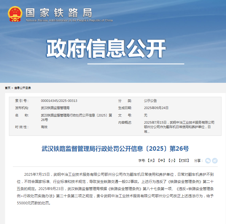 来自国家铁路局的消息显示:近日,武汉铁路监督管理局发布《行政处罚公开信息〔2025〕第26号》(以下简称《公开信息》)。《公开信息》称,2025年7月15日,武钢中冶工业技术服务有限公司鄂州分公司作为翻车机日常使用和养护单位,日常对翻车机养护不到位,不符合国家标准、行业标准和技术规范,导致发生铁路交通一般D2事故。上述行为违反了《铁路安全管理条例》第二十五条的规定。