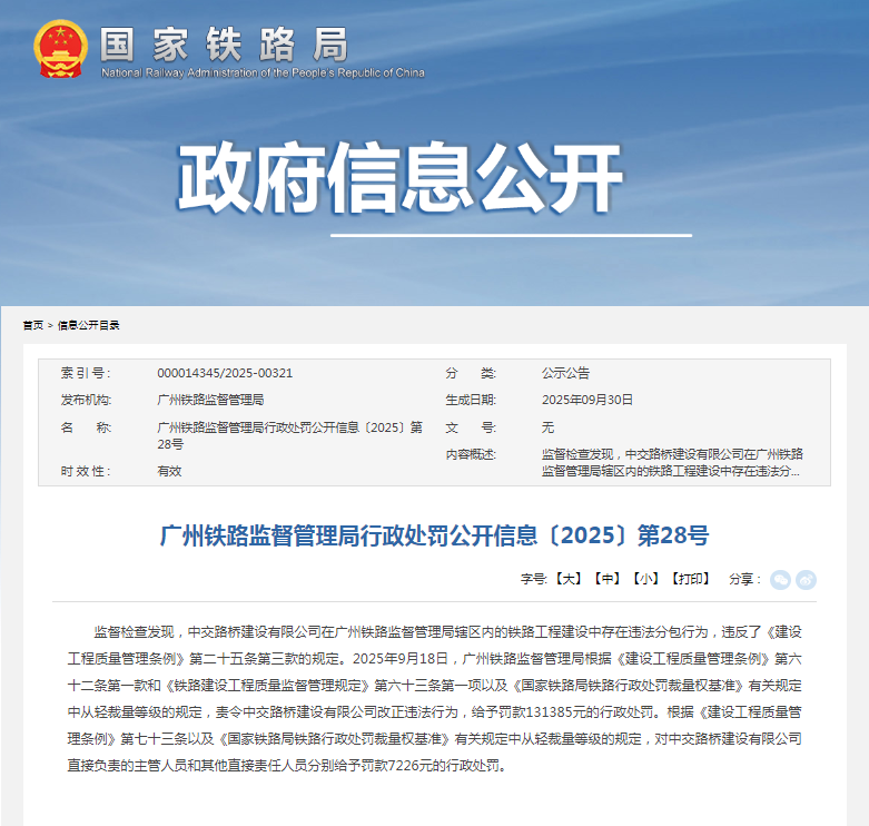 《公开信息》显示,2025年9月18日,广州铁路监督管理局根据《建设工程质量管理条例》第六十二条第一款和《铁路建设工程质量监督管理规定》第六十三条第一项以及《国家铁路局铁路行政处罚裁量权基准》有关规定中从轻裁量等级的规定,责令中交路桥建设有限公司改正违法行为,给予罚款131385元的行政处罚。
