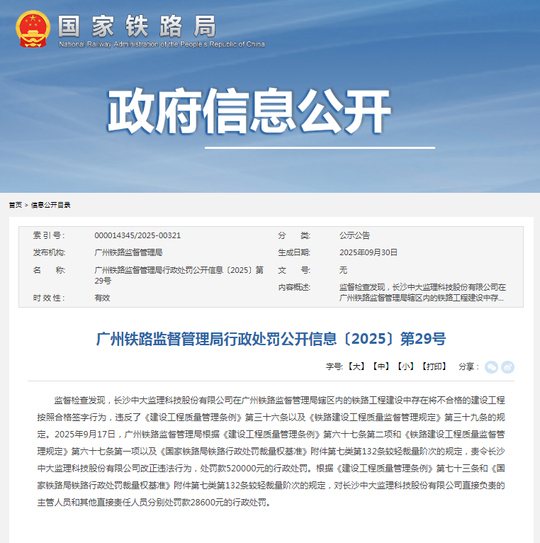 《公开信息》显示,2025年9月17日,广州铁路监督管理局根据《建设工程质量管理条例》第六十七条第二项和《铁路建设工程质量监督管理规定》第六十七条第一项以及《国家铁路局铁路行政处罚裁量权基准》附件第七类第132条较轻裁量阶次的规定,责令长沙中大监理科技股份有限公司改正违法行为,处罚款520000元的行政处罚。
