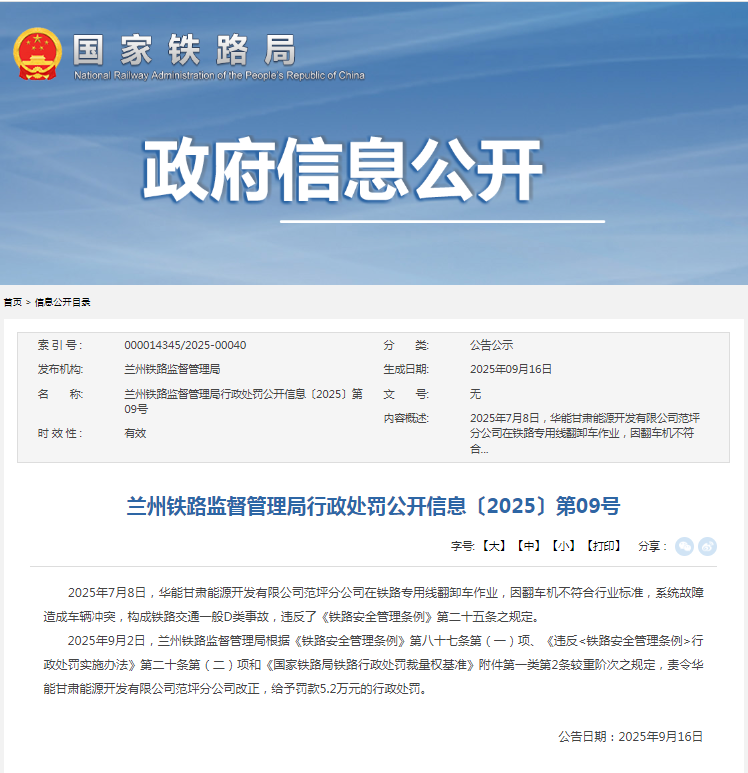 《公开信息》显示,2025年9月2日,兰州铁路监督管理局根据《铁路安全管理条例》第八十七条第(一)项、《违反<铁路安全管理条例>行政处罚实施办法》第二十条第(二)项和《国家铁路局铁路行政处罚裁量权基准》附件第一类第2条较重阶次之规定,责令华能甘肃能源开发有限公司范坪分公司改正,给予罚款5.2万元的行政处罚。