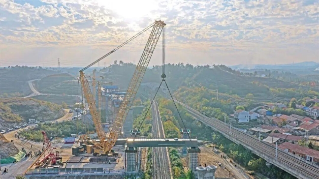 周家田村跨麻武线特大桥地处湖北红安境内,是合武高铁湖北段的重点控制性工程之一。这座特大桥全长1195.375米,共设32孔,此次完成吊装的2榀钢盖梁是大桥建设的关键构件。
