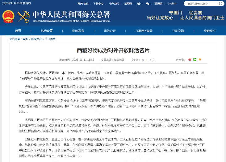 据拉萨海关统计,西藏7地(市)特色产品出口实现全覆盖,今年前三季度累计出口额超3000万元,冬虫夏草、藏红花、高原矿泉水等一批“藏字号”特色产品走向国际市场,成为西藏对外开放的鲜活名片。