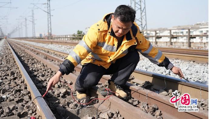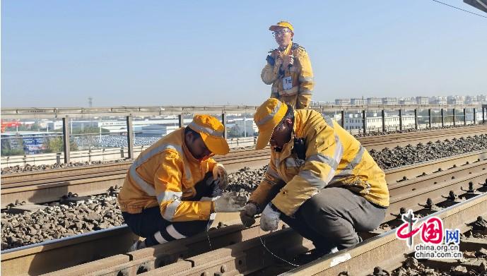 2025年11月24日,大机作业后,电务作业人员测试轨道区段电容容值。 姚晓尧 摄