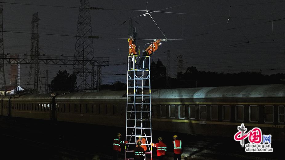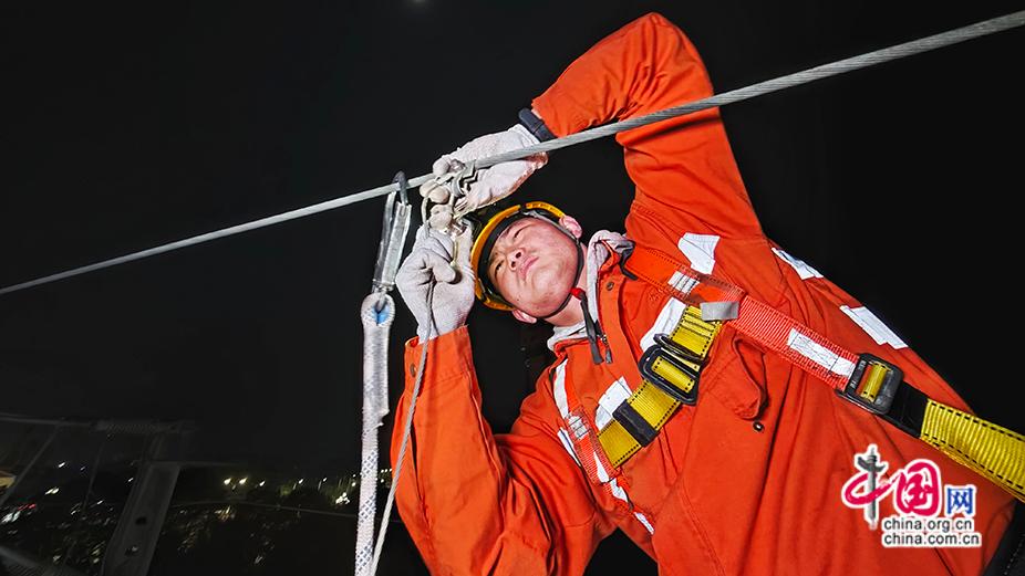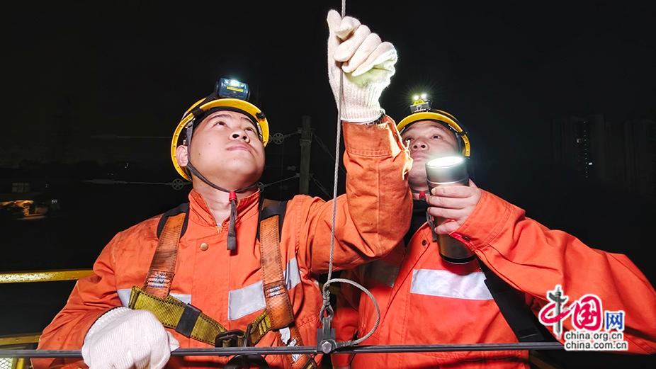 2025年12月4日,接触网工正在检查吊弦受力状态。代槐孚 摄
