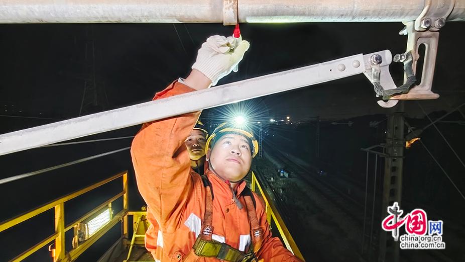 2025年12月4日,接触网工正在对接触网零件进行防松标画。代槐孚 摄