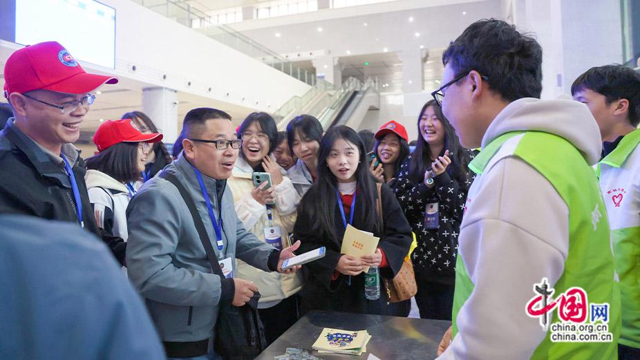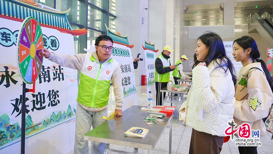 2025年12月8日,在永安南站研学启程互动区,志愿者与学生旅客互动。 庄钰翔 摄