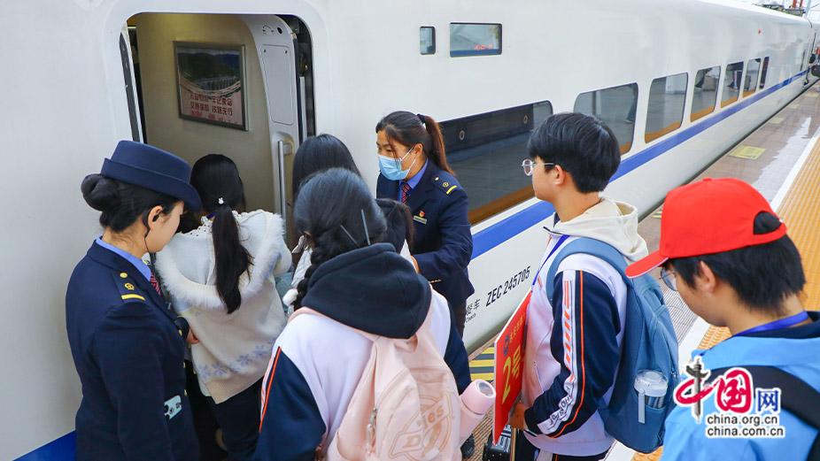 高二学生傅斯玥在铁路工作人员的科普下,了解了乘坐铁路的安全小知识,切身感受中国铁路的高速发展成就。“这次不仅体验到了温馨周到的服务,也上了一堂生动的出行实践课。”她分享着自己的出行感悟。