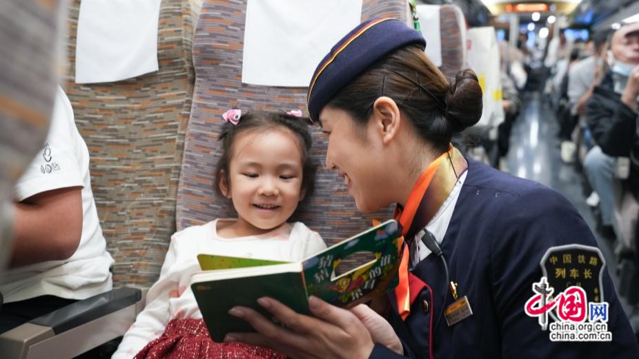 在“和之旅”值乘的G84次列车上,列车工作人员与车内小朋友亲切互动。邓宇翔 摄