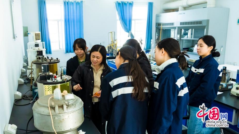 2025年12月10日,株洲检修车间化验工技师刘晶在指导青工李彦读滴定管数值。李红武 摄