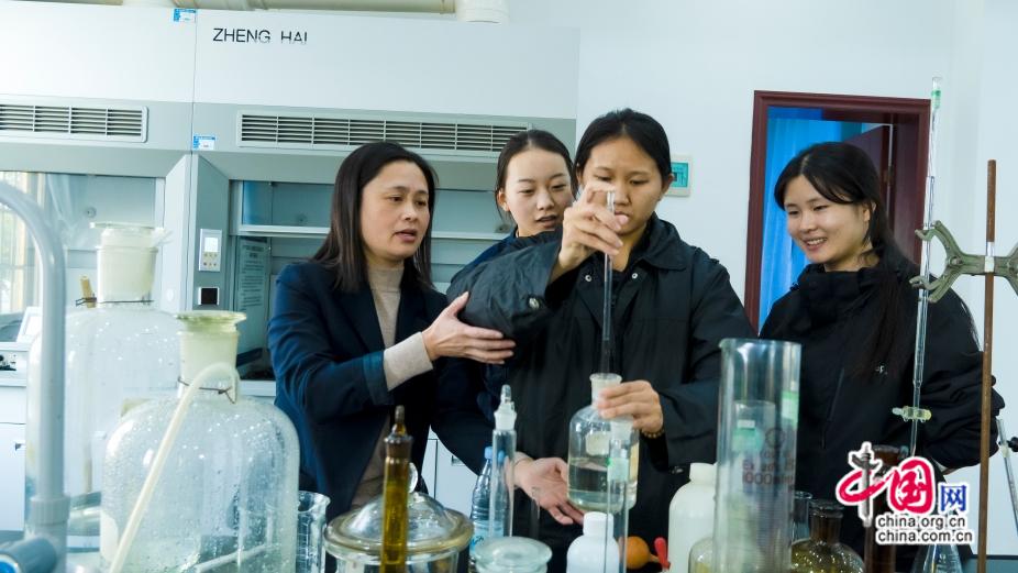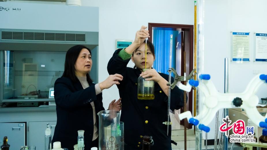 2025年12月10日,株洲检修车间化验工技师刘晶在教青工进行油脂化验。李红武 摄