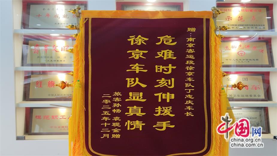 受助旅客家属为徐京车队列车长丁志庆送上锦旗。 谭力旗 摄