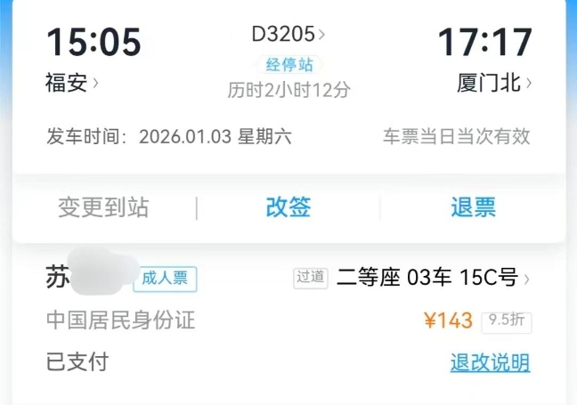 苏女士告诉记者,1月3日下午3点05分,她和老公带着3岁的孩子乘坐D3205次列车返程前往厦门北,苏女士的座位是03车15C号,而她26寸的黑色条纹行李箱则放在了3车厢最后排的空隙里,苏女士的老公在福州南站下车,这趟列车到达厦门北的时间是当天下午5点17分。“我老公下车后,我抱着孩子去看了一下,发现行李箱还在。此时距离列车到站还有20分钟左右。”而据12306的列车时刻表显示,福州南站的下一站就是终点站厦门北站。