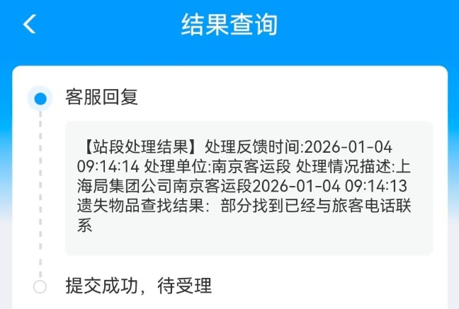 1月4日,客服回复苏女士称,上海局集团公司南京客运段反馈遗失物品查找结果:部分找到已经与旅客电话联系。寻找状态是发现相关物品,1月6日,记者通过12306客服热线证实了这一处理进展。