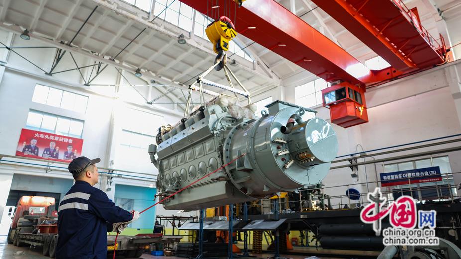 2026年1月8日,检修职工正在进行柴油机吊装作业。 许彬 摄