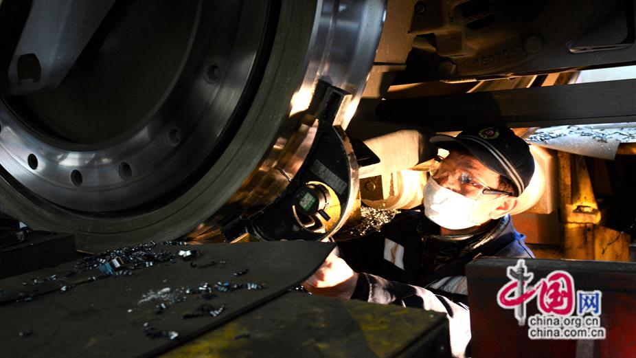 2026年1月8日,检修职工正在测量机车轮对轮径。 许彬 摄
