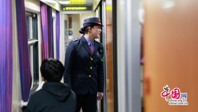 Z99次列车长李喆正在回应旅客询问。李忱 摄