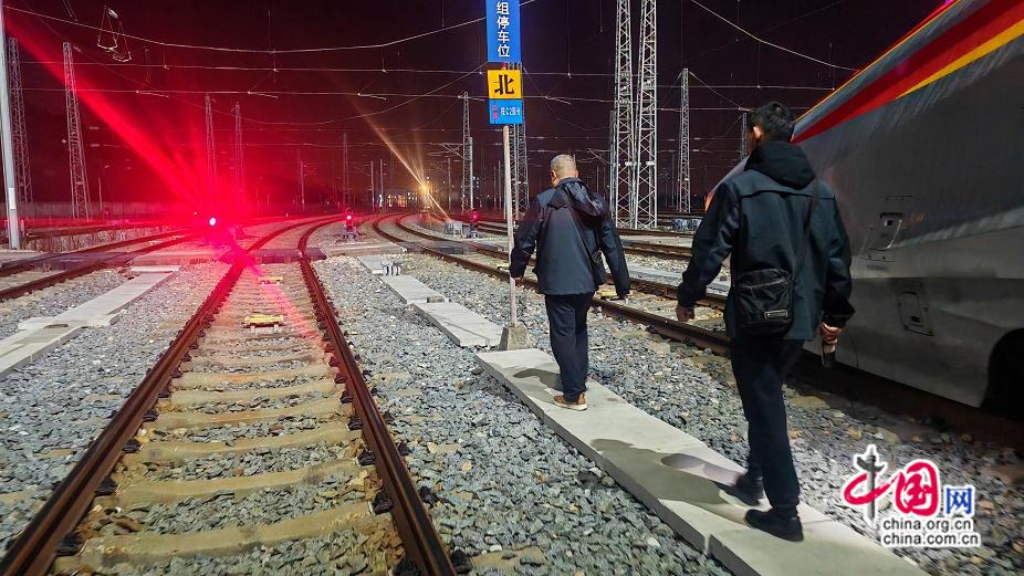 2026年1月13日晚,长沙南高铁整备车间党支部书记彭南茂在存车场看车。周劲 摄