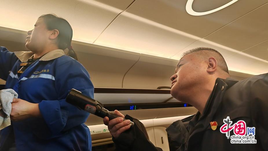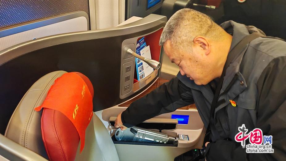 2026年1月13日晚,长沙南高铁整备车间党支部书记彭南茂检查商务座卫生。周劲 摄