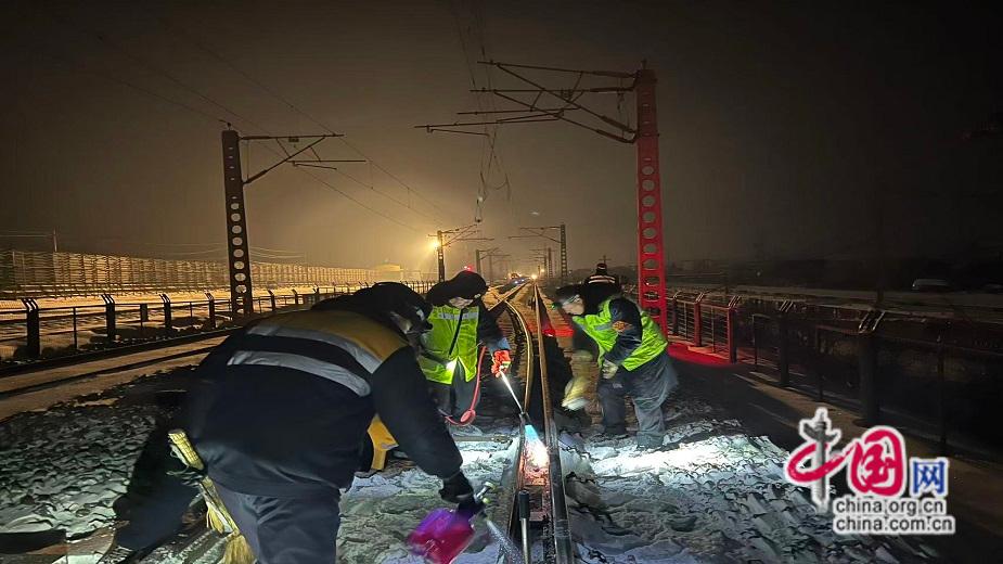 2026年1月19日夜里,洛阳车务段职工正在用喷火枪、防冻液进行除雪作业。 杨金科 摄