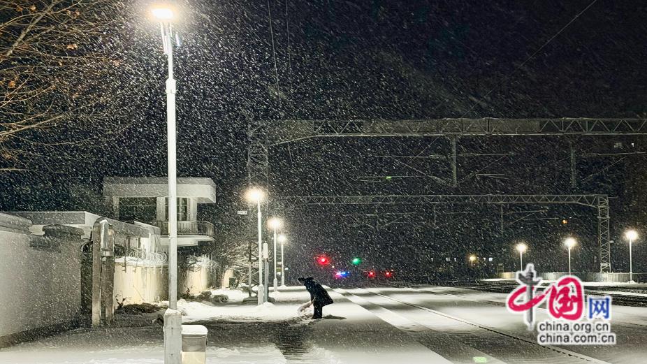 有个身影悄然闯入视线。那是位身着藏青色制服的铁路职工,正在站台那头手握铁锹,弯腰清理着积雪。雪花簌簌落上肩头、后背,远远望去好似为他披了件银灰色的绒衣。风掀起他的衣角,可他依旧弯腰、铲起、扬雪,手中动作丝毫未停。遇见蓬松的新雪是“噗嗤”的闷响,碰到雪下凝结的薄冰是“刺啦”的脆响,每扬一下锹,都能精准落在积雪最厚的地方,把刚落下的新雪和结了薄冰的旧雪一并清理干净。