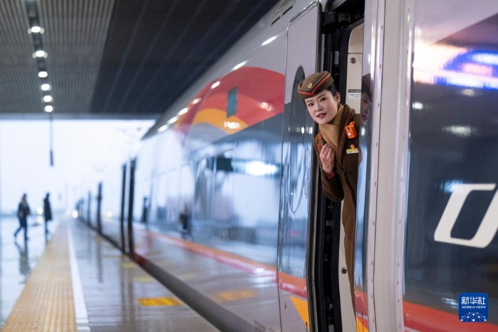 1月26日,在G340次列车上,列车长进行联控关门作业。新华社记者 伍志尊 摄