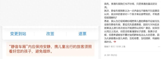 页面显示,标注“‘静音车厢’内应保持安静,携儿童出行的旅客须照看好您的孩子,避免喧哗。”该网友感到实在难安,“我家孩子属于安静的,但一点声音没有是绝对不可能的,这种该怎么办呢?”