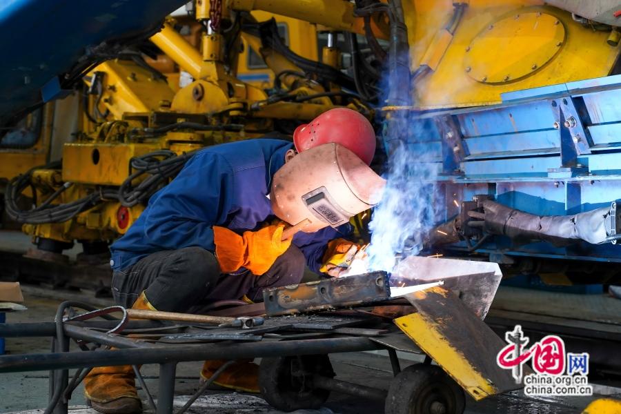 检修现场,机械轰鸣声、工具碰撞声交织成激昂的“检修交响曲”。一名名检修人员在大型养路机械旁忙碌着,或是俯身钻入车辆底部检查传动轴;或是手持焊枪专注进行部件焊接;或是对车轮部件进行探伤......