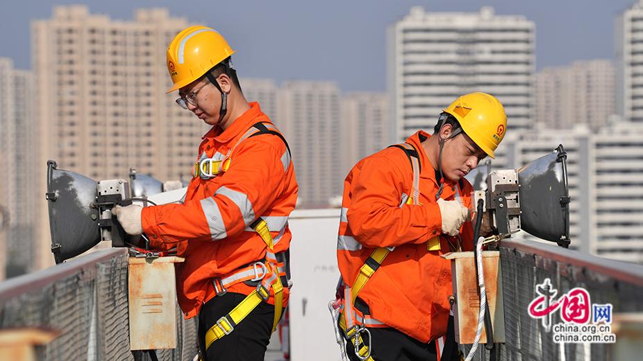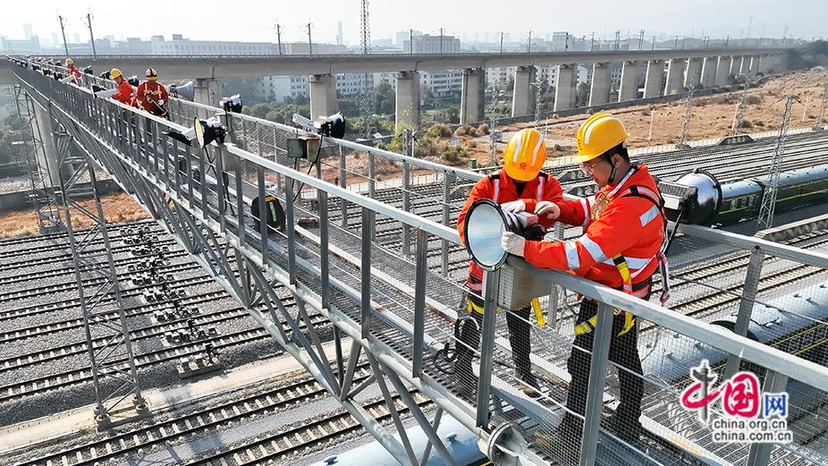 2026年2月2日,电力线路工在南昌西动车所投光灯桥上对投光灯进行检修。史俊男 摄