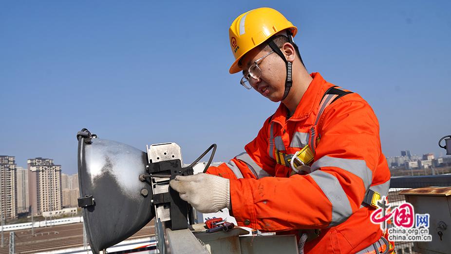 2026年2月2日,电力线路工于俊涛在南昌西动车所投光灯桥上对投光灯螺母进行紧固。赖锦辉 摄