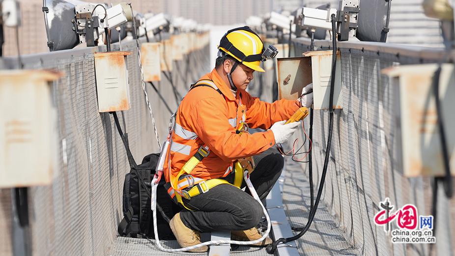 2026年2月2日,电力线路工钟小康在南昌西动车所投光灯桥上对配电箱状态进行检查。赖锦辉 摄