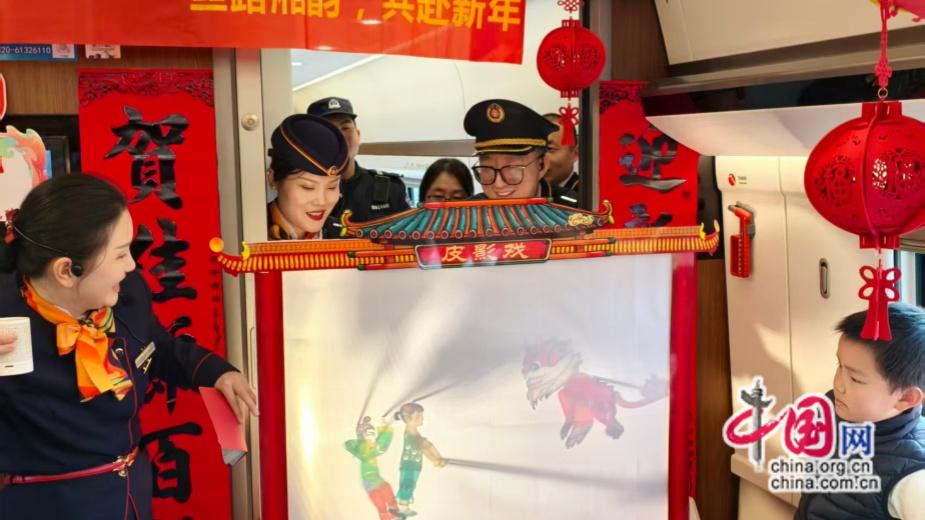 2026年2月10日,G403次列车上,两位列车长冯亿琳和张扬为旅客展示皮影戏操作。 贺馨葳 摄