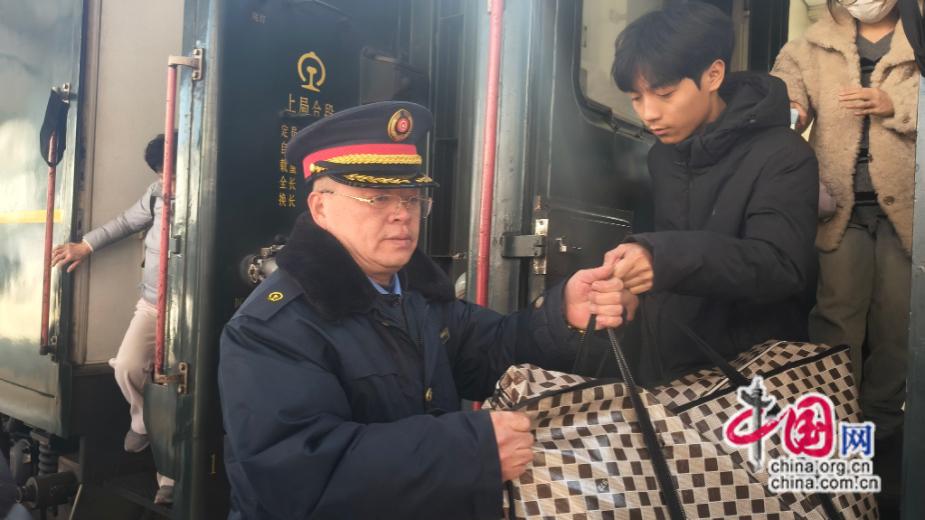 2026年2月2日春运首日,客运员李安涛协助携带大件行李的旅客下车。 李鹄强 摄