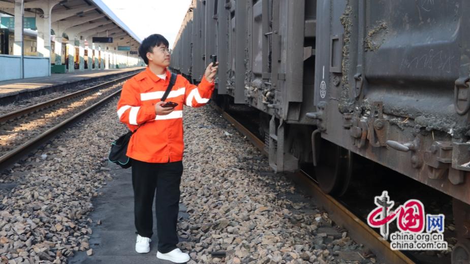 2026年2月11日,杨云利用手持机和摄录仪在核对检查列车编组信息。康佳宝 摄