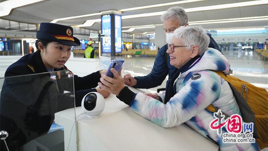 2026年2月12日上午9时许,福州南站客运值班员陈海敏引导外籍旅客快速检票进站。江曲 摄