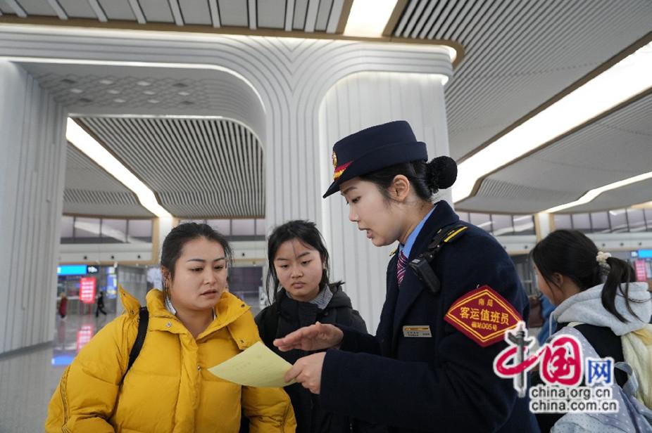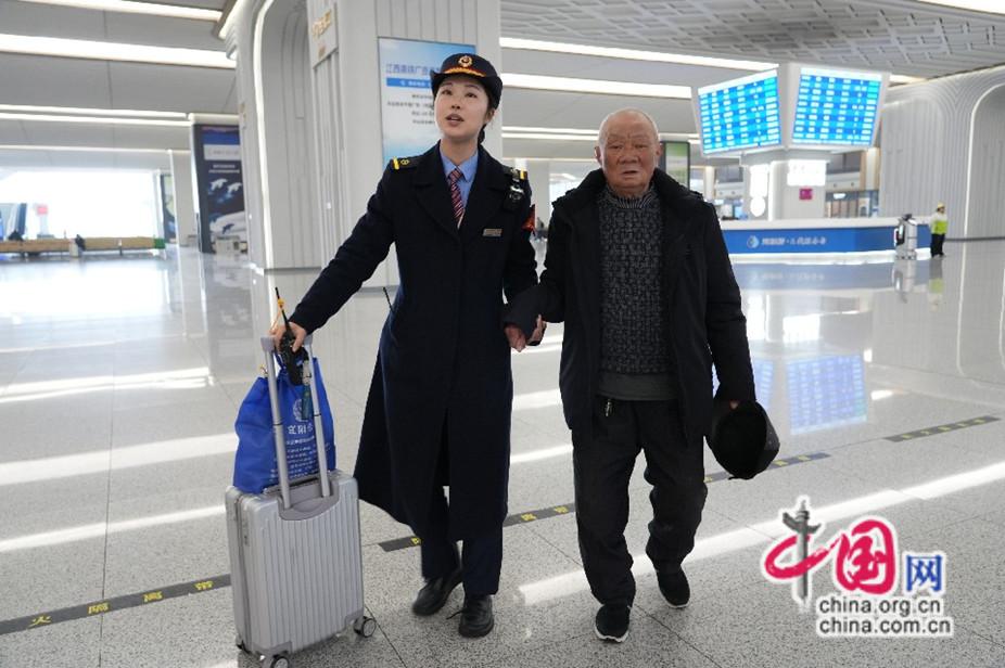 2026年2月12日,福州南站客运值班员陈海敏引导七旬大爷进站候车。江曲 摄