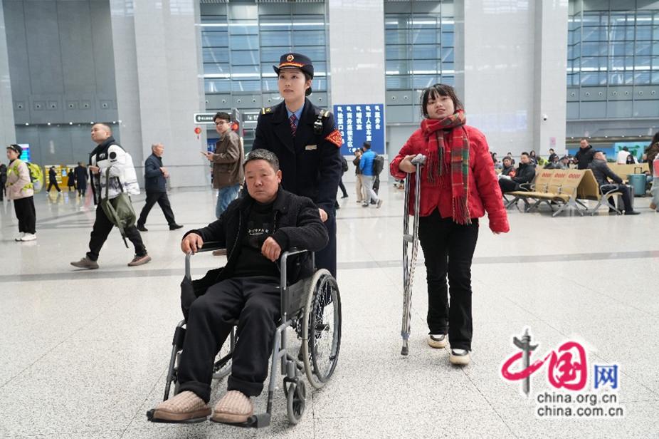 2026年2月12日,福州南站客运值班员陈海敏护送腿脚不便的旅客进站乘车。江曲 摄