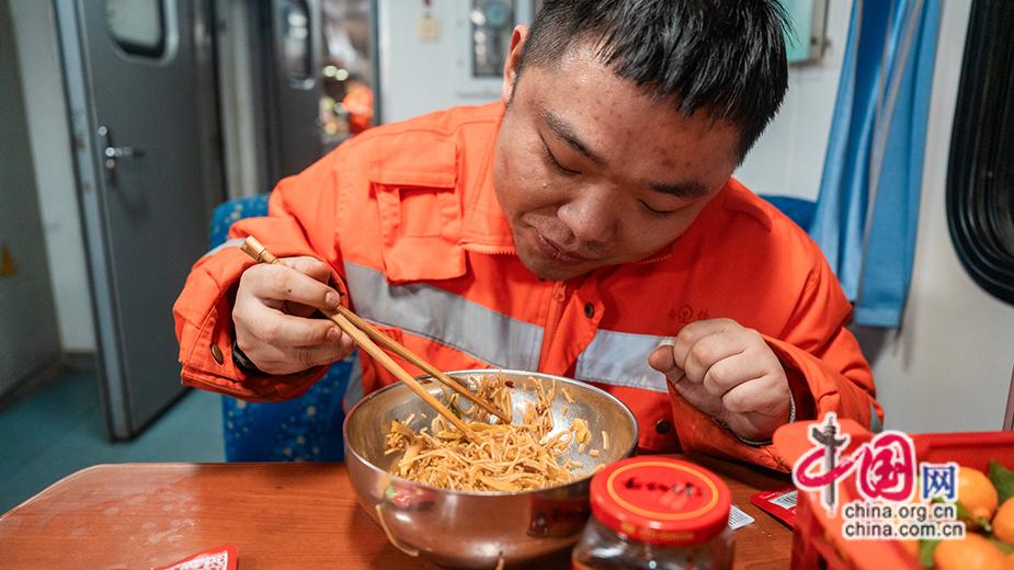 2026年2月10日凌晨,职工们在餐车里,吃着鲜肉炒粉。徐斌 摄