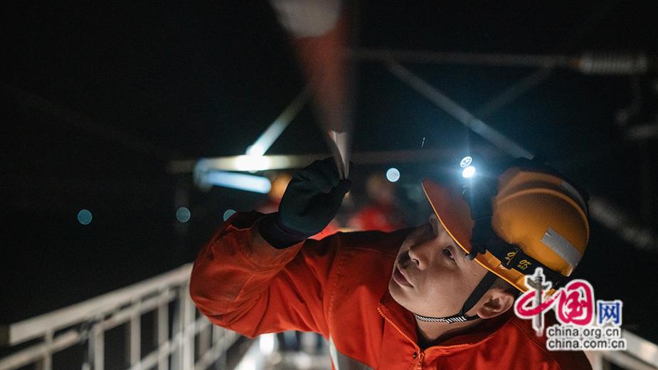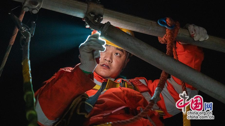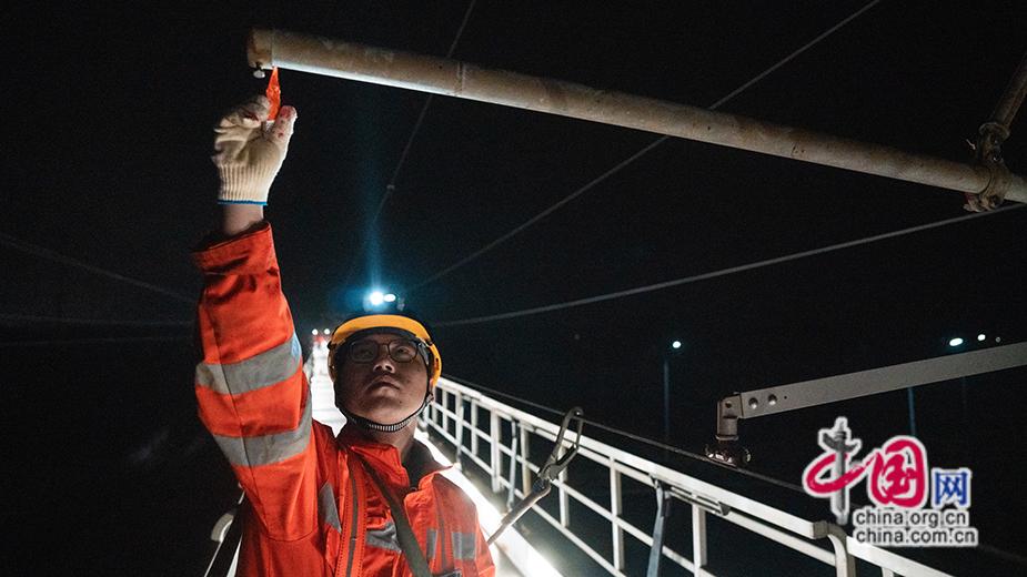 2026年2月10日凌晨,接触网工刘洋用记号笔对腕臂上的螺帽进行标记。徐斌 摄